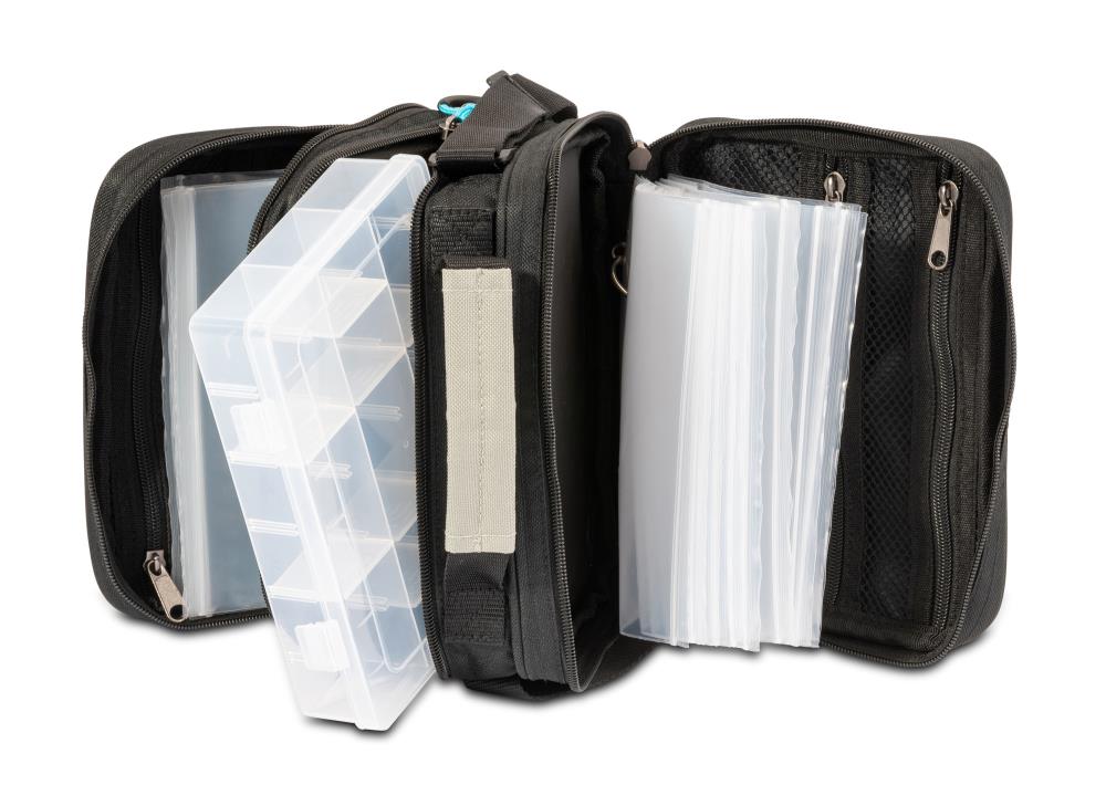 Die Meeresvorfachtasche schlechthin. Die mit 2 Ringordnern und insgesamt 15 Klarsichthüllen mit Zippverschluss versehene Tasche ist mit einem Schultergurt ausgestattet. Genau das Richtige, um beim hektischen Treiben auf dem Kutter jederzeit „Herr der Lage“ zu sein. In der mittleren Tasche befindet sich eine 11er Variobox 20 x 13,5 x 4 cm zum Verstauen von Pilkern, Zockern usw..., 5 eingenähte Meshtaschen stehen für weiteres Material zur Verfügung.