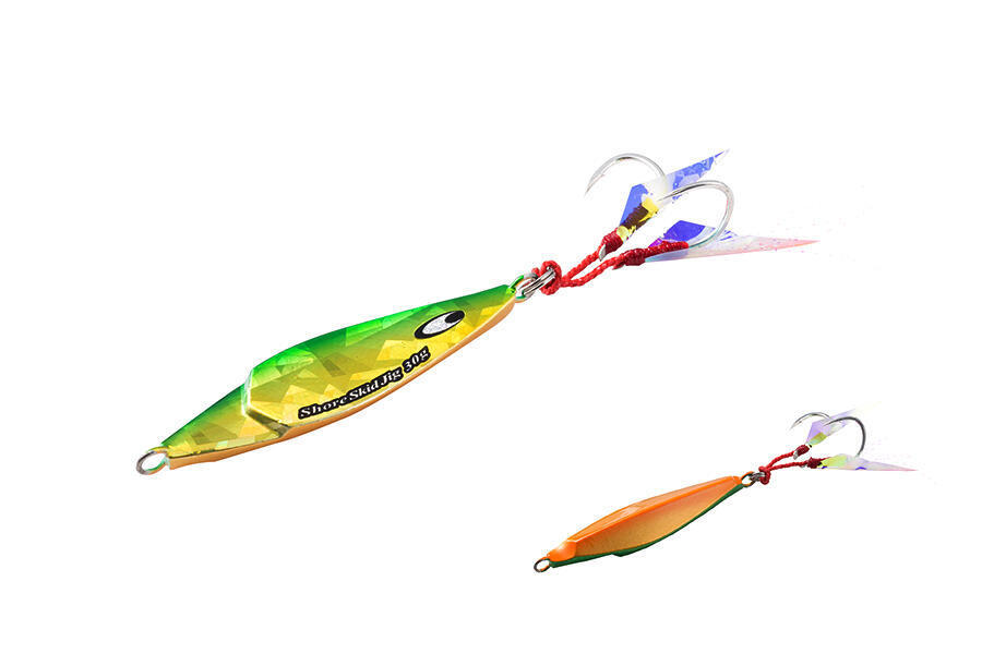 Die Entwickler des Salty Stage Shore Skid Jig  wurde durch die Pfeil- und Angriffsbewegung eines Tintenfisches inspiriert. Bei der Formgebung und Kontur ging es darum, einen "Switch Back"-Effekt zu erzeugen, um einen Tintenfisch zu imitieren, der auf Jagd geht. Die Bewegung erzeugt eine enorme Menge an Glitzern und Blitzen, die wahrscheinlich Raubfische aus einiger Entfernung anlocken wird. Das Schleudern von einer Seite zur anderen ahmt auch die Aktion eines Tintenfisches nach, der unter der Bedrohung durch einen Raubfisch in Panik gerät und verscuht zu flüchten. Der Skid Jig ist so konzipiert, dass er sowohl horizontal als auch vertikal funktioniert, so dass auch Bootsangler in dem Skid Jig eine lohnenswerte Alternative zu herkömmlichen Jigs finden werden. Der Jig lässt sich sehr gut werfen. Eine Sammlung von Skid Jigs in Ihrer Tackle-Box wird wahrscheinlich eine ganze Reihe von vertrauten Ködern in die letzte Ecke Ihrer Köderbox verbannen. Durch den günstigen Preis können Sie sich eine kleine Reihe von Farben und Gewichten in Ihre Köderbox legen, um auf alle Bedingungen vorbereitet zu sein. Der Köder ist optimal zum Slow Jiggen. Je nachdem, ob sie horizontal oder vertikal Jiggen, können Sie die Haken vom Kopf an das Ende montieren. Von diesem Jig sind sieben verschiedene Farben und Gewichte von 20g bis 60g verfügbar.