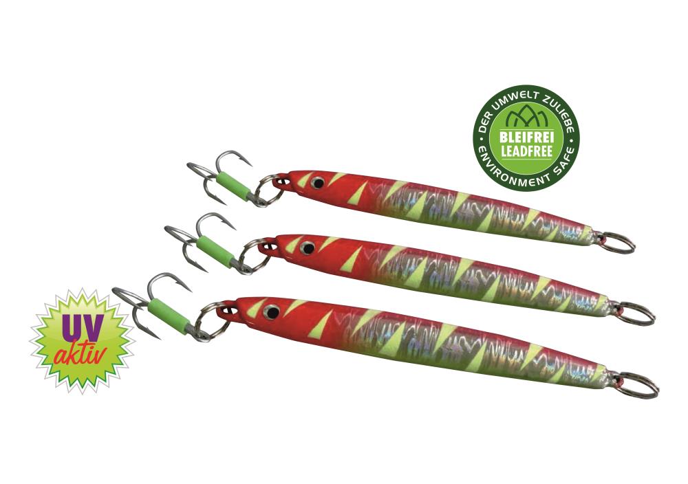 Dieser Super-Pilker ist bleifrei und mit einer UV-aktiven Folie und Lackierung versehen. Es stehen Gewichte von 200g, 300g und 400g zur Verfügung. Die Drillinge verfügen über einen Fluo-Schlauch, der für zusätzliche Lockwirkung sorgt.