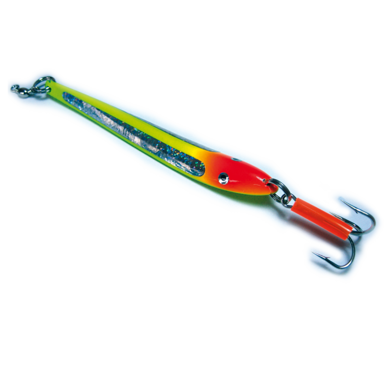 Der Pilker besitzt eine rote Spitze und einen gelblichen Schaft, der zusätzlich mit Glitzerfolie versehen wurde. Diese Kombination erzeugt starke Lichtreflexe und macht ihn besonders attraktiv für Räuber in verschiedenen Wassertiefen.