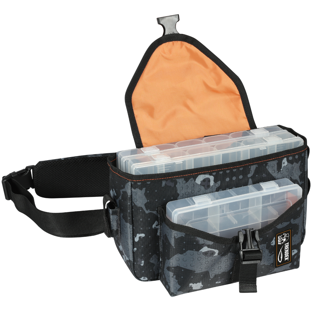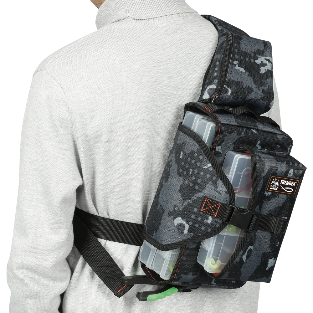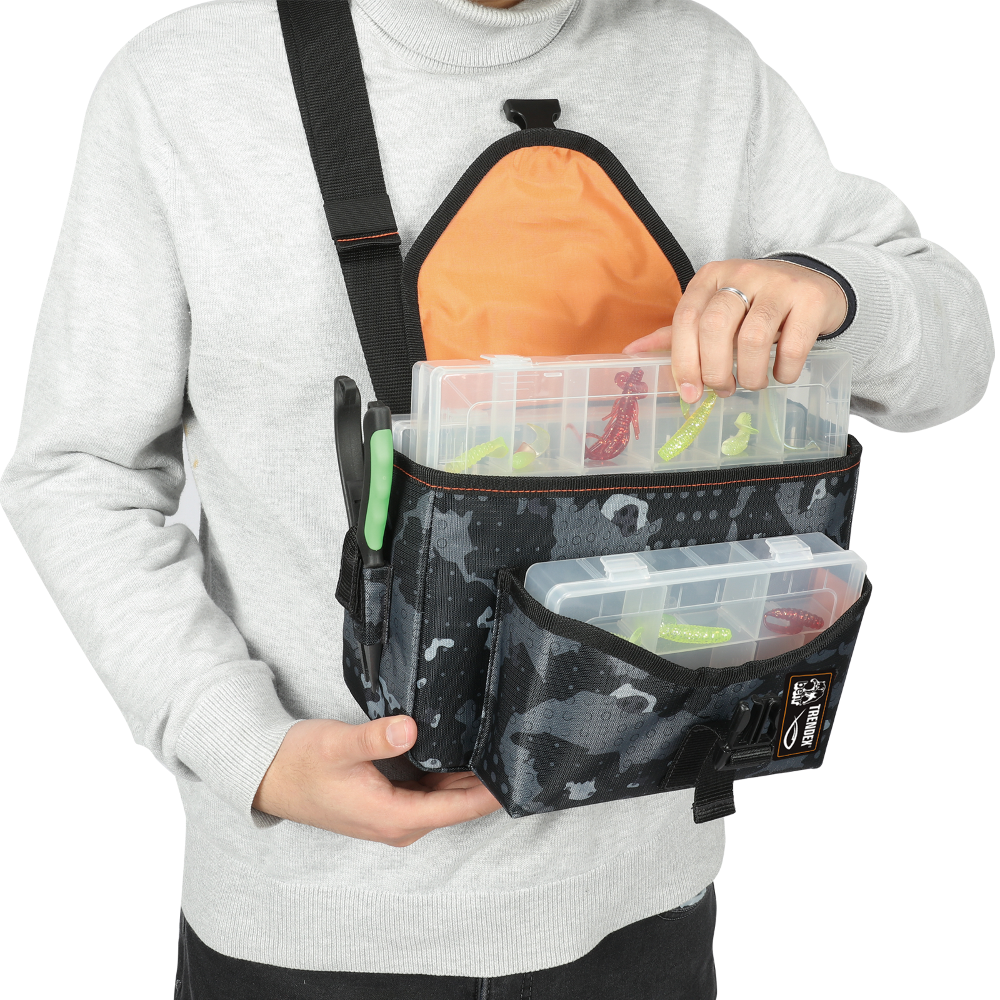 Die Tasche kann flexibel mit Schultergurt getragen oder alternativ am Bauch befestigt werden – ideal für lange Sessions und maximale Bewegungsfreiheit. Das durchdachte Stauraumkonzept sorgt für Ordnung und schnellen Zugriff auf Köder und Zubehör.