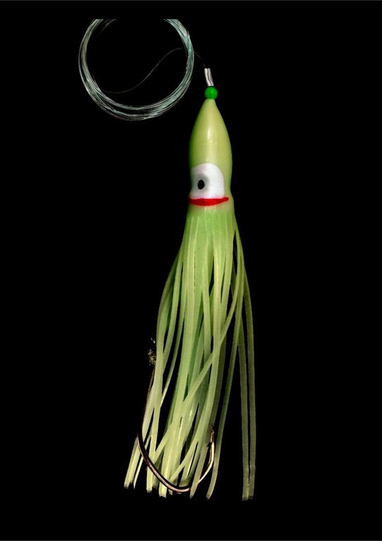 Der Oktopus ist an einem starken Vorfach und einem scharfen Haken montiert. Zusätzlich ist ein grünes LED Blitzlicht integriert, welches die Lock- und Reizwirkung der Fische extrem erhöht. Nur in Verbindung mit Wasser beginnt die Leuchtfunktion. Die Länge des Vorfaches beträgt ca. 160cm. Es gibt zwei Varianten, eimal mit 11cm großen Oktopus und Hakengr. 3/0, sowie mit 17cm langen Oktopus und 8/0 Haken. Die Vorfachstärke beim kleineren Oktopus ist 0,80mm und bei der größeren Variante 1,00mm.