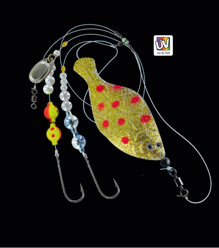 Dieser UV-aktive Inline-Butt-Löffel in Schollen-Form ist ideal zum Plattfisch- und Meeresangeln. Am Löffel ist ein komplett fertiges Vorfach mit zwei Haken (Wirbel, Haken, Spinnerblättchen, Schnur sowie Leuchtperlen) bereits montiert. Die unterschiedlichen Farbvarianten sind UV-aktiv und erhöhen in Verbindung mit den Leuchtperlen den Lockreiz.
