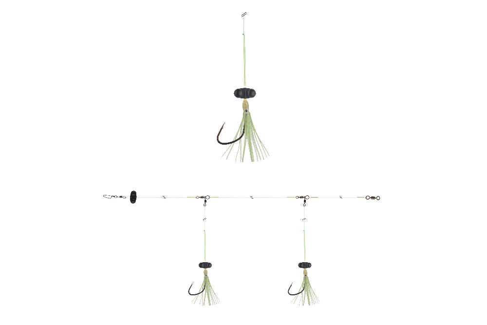 - Optimierte Handhabung: Die speziellen Rotationswirbel an den Seitenarmen, der Knotenschutz und die Tubes am Oktopus verhindern ein Verdrallen der Montage beim Absinken und bei starker Strömung, was die Handhabung erheblich erleichtert.
