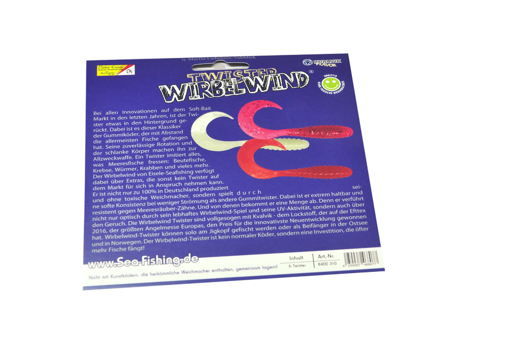 Der Twister ist eine Allzweckwaffe zum Fang von Fischen. Dieser Köder besticht durch eine Vielzahl von Eigenschaften, die ihn von anderen Ködern am Markt unterscheidet. Er wird zu 100% in Deutschland produziert und besteht nicht aus toxischen Weichmachern. Der Wirbelwind spielt sehr verführerisch auch bei wenig Strömung, was seiner soften Konsistenz geschuldet ist. Er ist aber dennoch sehr haltbar und und resistent gegen Meeresräuber-Zähne. Er verführt diese nicht nur durch seine UV-Aktivität, sondern auch über den Geruch. Die Twister sind vollgesogen mit dem revolutionären Lockstoff Kvalvik. Der Wirbelwind-Twister kann solo am Jigkopf gefischt werden oder als Beifänger in der Ostsee und in Norwegen. Die vielen Vorteile dieses Köder sprechen für ihn. Es gibt die Twister in 2 Ausführungen, welche in 2 x drei unterschiedlichen Farben sortiert angeboten werden.