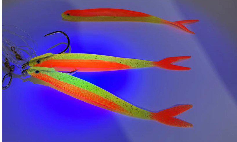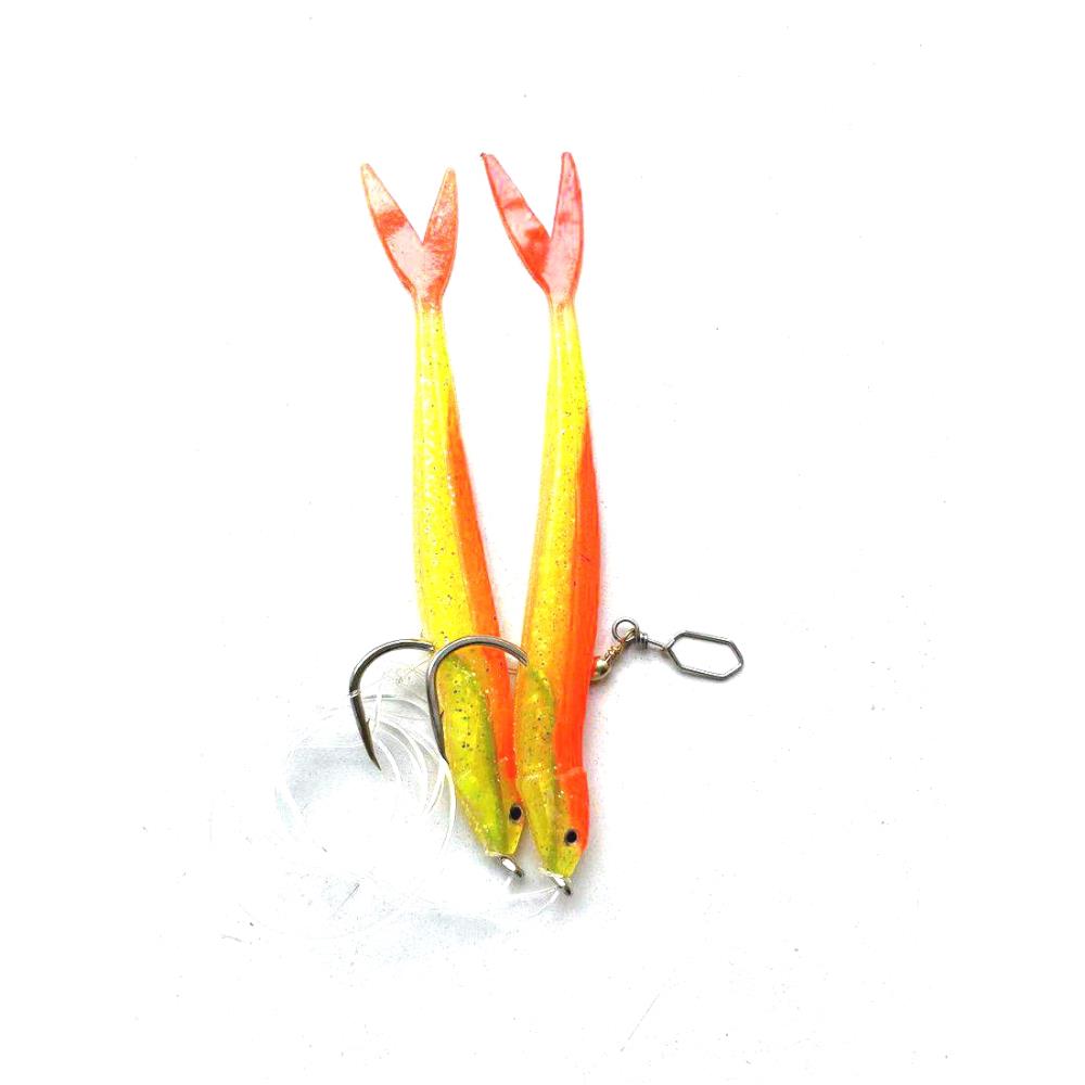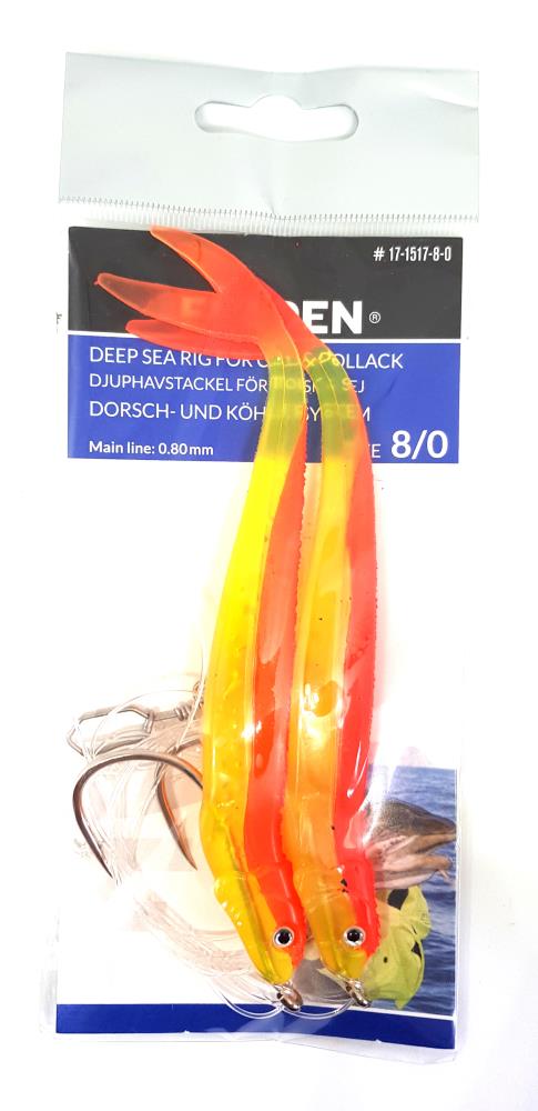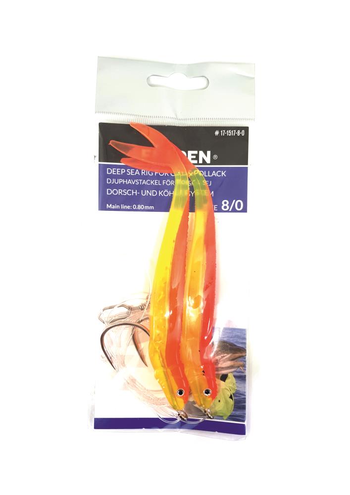 Dieses Twintail-Rig besteht aus zwei länglichen Gummifischen (14cm), die Sandaale imitieren. Sie sind auf Haken der Größe 8/0 montiert und an einer monofilen Hauptschnur der Stärke 0,80mm befestigt. Es gibt dieses Vorfach in den Farben Blue-Glitter, Yellow-Red und Black-Glitter. Es ist ideal zum Fang von Dorsch und Seelachs geeignet.