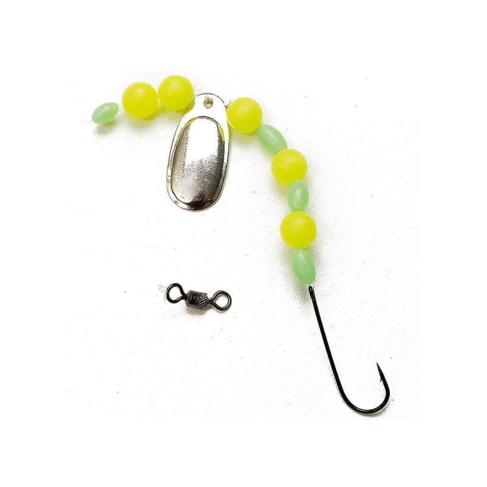 Plattfischvorfach mit einem Haken, verschiedenen Leuchtperlen und einem Spinnerblatt. Es stehen zwei Varianten jeweils mit Hakengröße 1 und 2 zur Auswahl.