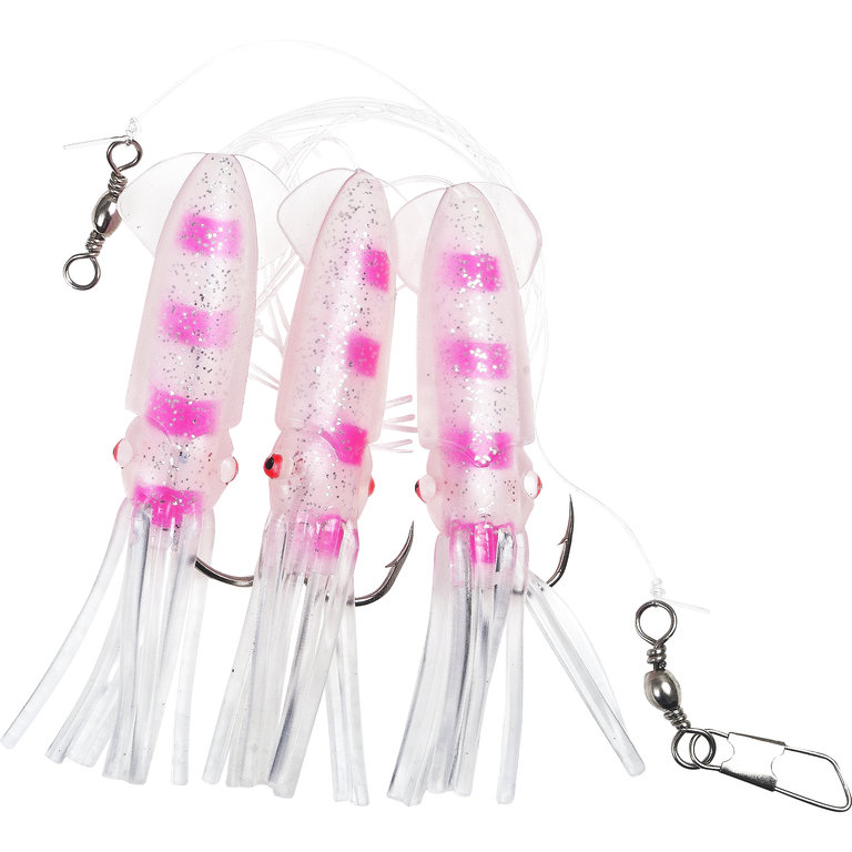 Dieses Vorfach besteht aus drei geflügelten Octopussen. Es stehen drei Farben zur Auswahl. Das Rig ist in den Hakengrößen 4/0, 8/0 und 10/0 lieferbar. Somit deckt dieses fängige Vorfach als Köder die ganze Palette der Salzwasserräuber ab. Das Rig ist an einer 0,60mm starken Hauptschnur befestigt.