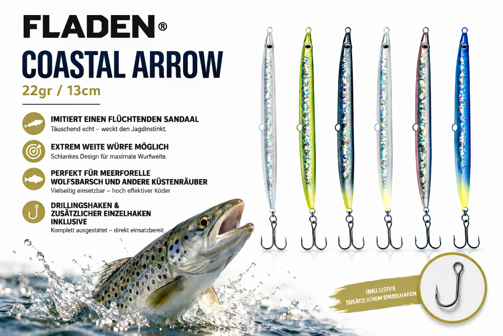Der FLADEN Maxximus Coastal Arrow 22g / 13cm ist damit die perfekte Wahl für Angler, die einen vielseitigen, weit fliegenden und extrem fängigen Küstenköder suchen.