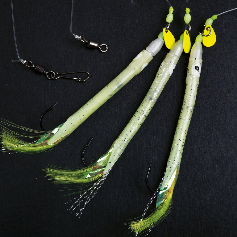 Dieses Vorfach wird in unterschiedlichen Größen angeboten. Es besitzt 3 Haken. Die Hakengröße reicht von 1/0 - 12/0. Vor jedem Haken ist ein separates Spinnerblatt montiert. Die Haken besitzen Federn und Leuchtschlach. Die Länge des Vorfaches beträgt 110cm und hat einen Durchmesser je nach Hakengröße von 0,50mm - 0,80mm. Dieses Vorfach ist ideal für Dorsch und Köhler geeignet, aber auch Makrelen lieben es. Durch die unterschiedlichen Größen können Sie es individuell an die unterschiedlichen Bedingungen anpassen.