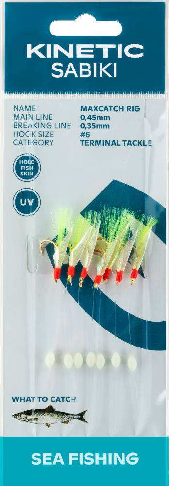 Das Kinetic Sabiki MaxCatch hat 7 Haken und die Stärke, um Ihren Eimer schnell zu füllen. Kleine, aber kräftige Haken biss-provozierender Fischhaut und Flash-Fibern funktionieren nun mal perfekt!