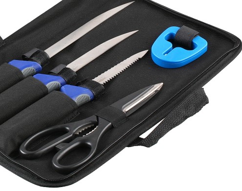 Dieses Set beinhaltet Messer aus qualitativ hochwertigen, japanischen 440 Edelstahl. Es ind 2 Filetiermesser mit 6 und 8 inch enthalten. Sie besitzen eine speziell profilierte, weiche und super scharfe Klinge, die perfekt für das Trennen des Fleisches von der Gräte sind. Weiter gibt es ein 5 inch Ausbeinmesser mit Wellenschliff sowie einem Messerschärfer. Alle Messer im Set besitzen einen rutschfesten Griff und sind in einem praktischen Etui verpackt. Zusätzlich ist in diesem Etui ein Schneidebrett enthalten.