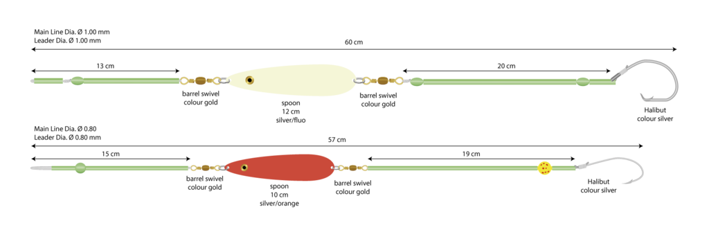 Diese vorgefertigten Rigs sind für das Angeln mit einem Sea Boom geeignet. Empfohlen vor allem für das Angeln auf Lumb und Leng mit Fischfilets und ganzen toten Fischen. Es hat einen Spoon, der die Fische anzieht und sie zum Anbiss verleitet. Das Vorfach ist 57cm bzw. 60cm lang. Die Hauptschnur besteht aus starker 1,00mm dicken Monofilschnur und die Vorfachschnur hat eine Stärke von 0,80mm. Das eine Vorfach hat einen Circle-Hook mit einem 12cm langen Spoon in der Farbe Fluo. Das andere Vorfach besitzt einen normalen Haken und einenr roten Spoon von 10cm Länge. Es sind zwei Systeme enthalten.