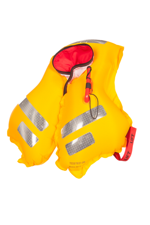 The vest inflates automatically upon contact with water. The air chamber is inflated immediately. If this does not happen, which is very unlikely, the life jacket can be activated manually using the pull line.