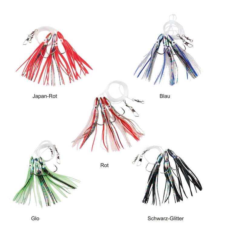 Erhältlich in 5 fängigen Farben, bietet dieses System eine optimale Anpassung an unterschiedliche Wassertrübungen und Lichtverhältnisse. Die hochwertigen 5/0-Haken sorgen für zuverlässigen Halt – auch bei kräftigen Fischen.