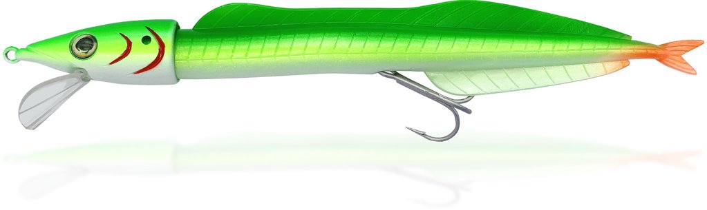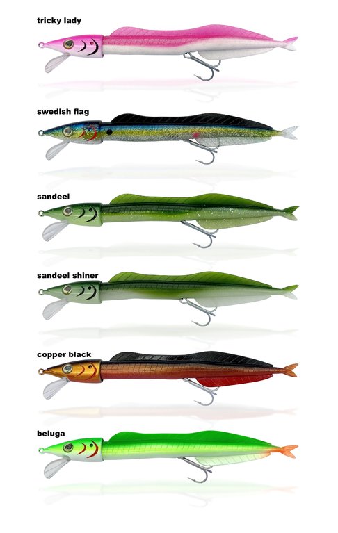 Mit dem Rhino Sandaal-Baitholder ist es möglich, sowohl Sandaale aus Gummi (im Lieferumfang enthalten) als auch entsprechende Naturköder einzusetzen. Beim Einsatz echter Sandaale wird das Haken-Rig von hinten durch die Kiemen durch das Maul geführt und in der Öse im Kopf gesichert, während der Haken an der Flanke eingestochen wird. Die Sicherung des Köders in Kopf erfolgt mit einem Zahnstocher. In der ausgelieferten „ready to fish“-Variante ist bereits ein naturgetreuer Sandaalschwanz montiert. Sein Laufverhalten ähnelt dem eines natürlichen Sandaals sehr, je nach Anströmung schwänzelt er nicht nur, sondern bricht ab und an seitlich aus – bis hin zu einer ganzen Rolle um die Längsachse. Dieses Laufverhalten scheint den Räubern sehr zu gefallen, denn unzählige Fische wurden schon in der Testphase überlistet. Die Attacken waren teilweise so hart, dass vom System nur noch der Kopf aus dem Maul herausschaute. Ideal einzusetzen bei Geschwindigkeiten zwischen 1,5 und 2,5 Knoten. Die Ersatzschwänze sind auch einzeln zu erhalten. Der Köder ist 20cm lang und 25g schwer.