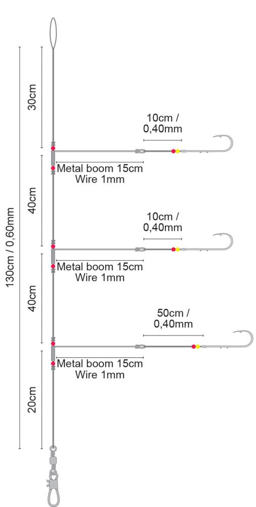 Dieses Vorfach besteht aus drei Seitenarmen die an 15cm Metall-Booms befestigt sind. Das Vorfach ist 130cm lang und besteht aus einer 0,60mm starken monofilen Hauptschnur. Die Haken der Seitenarme sind an einer 0,40mm starken Schnur befestigt. Das Vorfach ist mit verschiedenen Hakengrößen verfügbar.