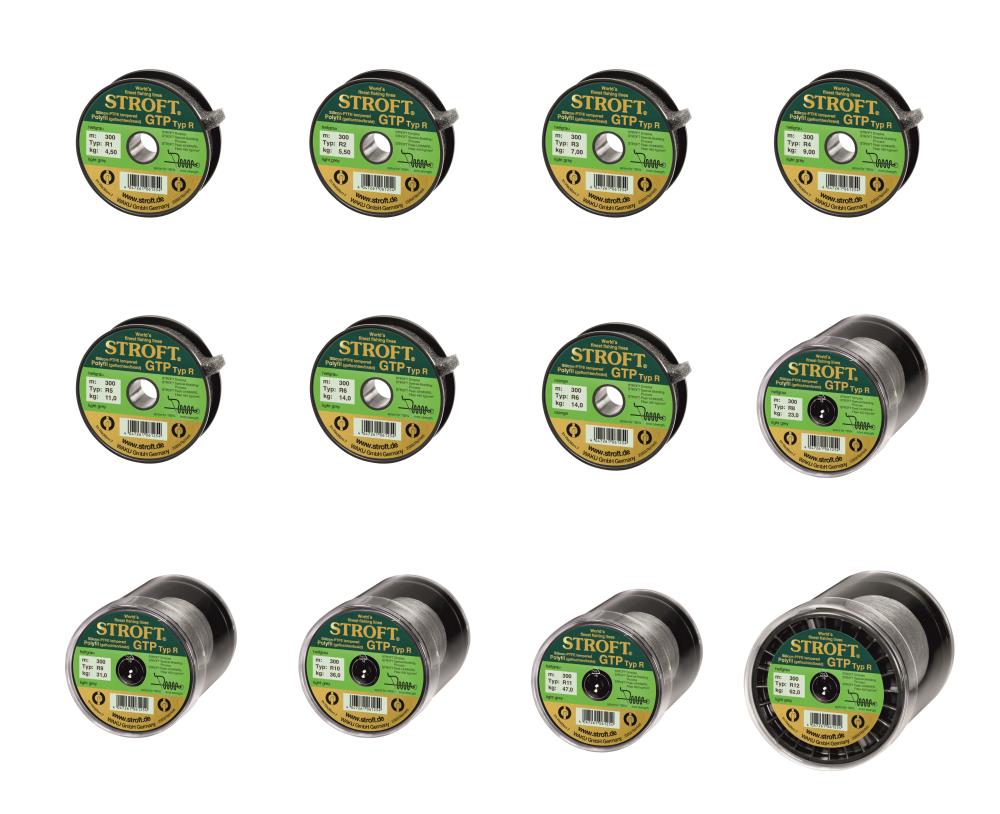 Das „R“ steht für „round and tight“, also für „rund und fest“. Diese Schnur wird in einem ganz speziellen Flechtverfahren aus Peak- UHMWPE-Fasern hergestellt. Typ R12 besteht z.B. aus 300×8 = 2400 Einzelfasern, die in einem sehr kleinen Winkel miteinander verflochten werden. Dadurch wird ein nahezu kreisrunder Schnurquerschnitt erzeugt, der an der Oberfläche pfeilähnliche Dimpel (engl. Grübchen) aufweist. Diese „runde und feste“ Spezialflechtung birgt neben den sehr guten Gesamteigenschaften aber noch einen anderen großen Vorteil, den viele andere der sogenannten „Geflochtenen“ nicht haben. Nämlich: Bei allen STROFT GTP Schnüren lässt sich eine selbstklemmende gespleißte Schlaufe herstellen, die eine deutlich höhere Tragkraft hat als alle ansonsten bekannten Knotenverbindungen (siehe auch Seite 34 im Katalog).