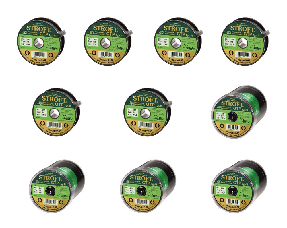 Das „R“ steht für „round and tight“, also für „rund und fest“. Diese Schnur wird in einem ganz speziellen Flechtverfahren aus Peak- UHMWPE-Fasern hergestellt. Typ R12 besteht z.B. aus 300×8 = 2400 Einzelfasern, die in einem sehr kleinen Winkel miteinander verflochten werden. Dadurch wird ein nahezu kreisrunder Schnurquerschnitt erzeugt, der an der Oberfläche pfeilähnliche Dimpel (engl. Grübchen) aufweist. Diese „runde und feste“ Spezialflechtung birgt neben den sehr guten Gesamteigenschaften aber noch einen anderen großen Vorteil, den viele andere der sogenannten „Geflochtenen“ nicht haben. Nämlich: Bei allen STROFT GTP Schnüren lässt sich eine selbstklemmende gespleißte Schlaufe herstellen, die eine deutlich höhere Tragkraft hat als alle ansonsten bekannten Knotenverbindungen (siehe auch Seite 34 im Katalog).