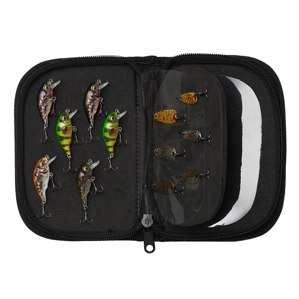 Reißverschluss-Etui aus weichem, strapazierfähigem 600 D-Gewebe. Mit Schlitzen im Innenfutter und Schaumstoffwand mit PVC-Trennwänden. Perfekt für aufgeriggte Köder mit Drilling oder Einzelhaken. Fasst 12 Köder, zusätzlich viel Platz für Haken in der Schaumstoffwand. Übergroße Reißverschlüsse mit Nylon-Zipper.