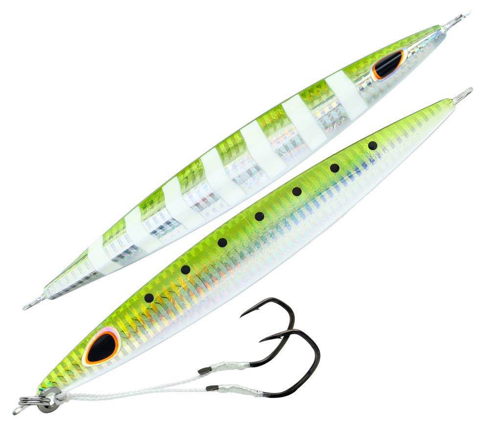 Der asymmetrische Gomoku Kensaki schneidet mit seiner messerspitzenartigen Form das Wasser, so dass er schnell auf Tiefe kommt Die Inline-Ösen stabilisieren den Jig während des Absinkens und verbessern die flatternde Aktion an loser Schnur. Verwenden Sie die “Lift & Fall” Slow-Pitch-Technik, um den Gomoku Kensaki aggressiv „darten“ zu lassen, gefolgt von einem engem, horizontalem Flattern im Fall. Ausgestattet ist er mit zwei VMC® Assist-Haken.