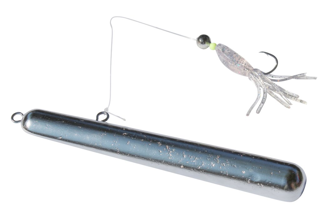 An der Seite des Klopfers ist ein robustes 0,80 mm starkes Vorfachmaterial befestigt. Am Ende des Vorfachs befindet sich eine perfekt abgestimmte Kombination aus Lockperle, Leuchtoktopus und einem Einzelhaken der Größe 5/0. Dieser Haken wird idealerweise mit Fischfetzen oder Garnelen beködert – ein Ködersetup, das sich in der Praxis als extrem fängig erwiesen hat.