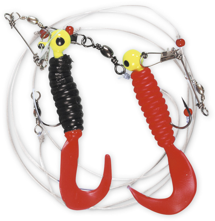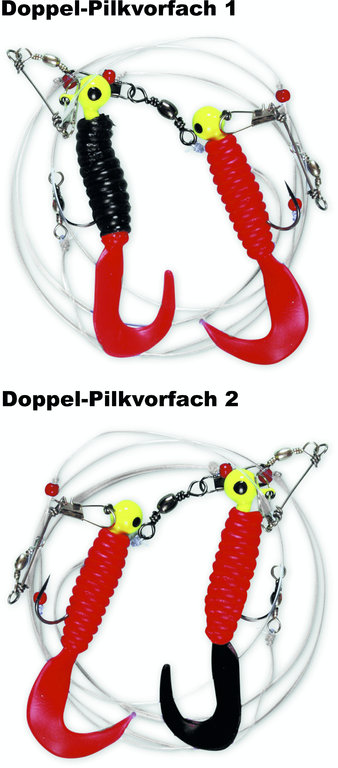 Dieses Doppel-Twister-Vorfach besteht aus zwei roten 6,5cm großen Twistern, welche an einer 0,65mm starken Vorfachschnur montiert sind. Das Vorfach ist an einer 0,70mm starken Hauptschnur befestigt. Die Hakengröße des Vorfaches ist 3/0.