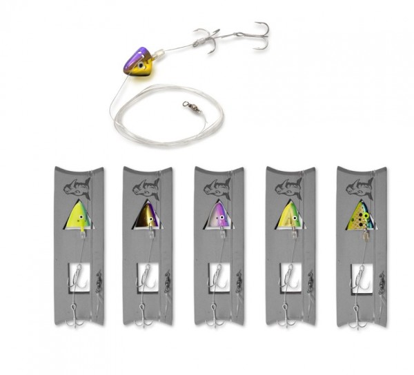 Dieses Rig ist erhältlich in fünf verschiendenen Farben und zwei Bait Holder-Größen. Es ist fertig zum Abwickeln vom eigens gestalteten EVA-Aufwickler. Das Rig ist ausgestattet mit zwei VMC-Drillingen 9650PS in Perma Steel-Ausführung, sowie hochwertiger Qualitätsmonofilschnur mit einen Durchmesser von 0,50mm. Die Länge beträgt 120cm. Alles ist perfekt aufeinander abgestimmt und sorgfältig geknotet.