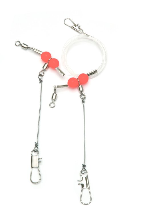 Dieses Pilkvorfach steht in zwei Varianten mit einem oder zwei Armen zur Verfügung. Die Schnur hat einen Durchmesser von 0,60mm und ist 80cm bzw. 120cm lang. Verziert sind die Edelstahl-Abstandshalter mit roten Lockperlen.