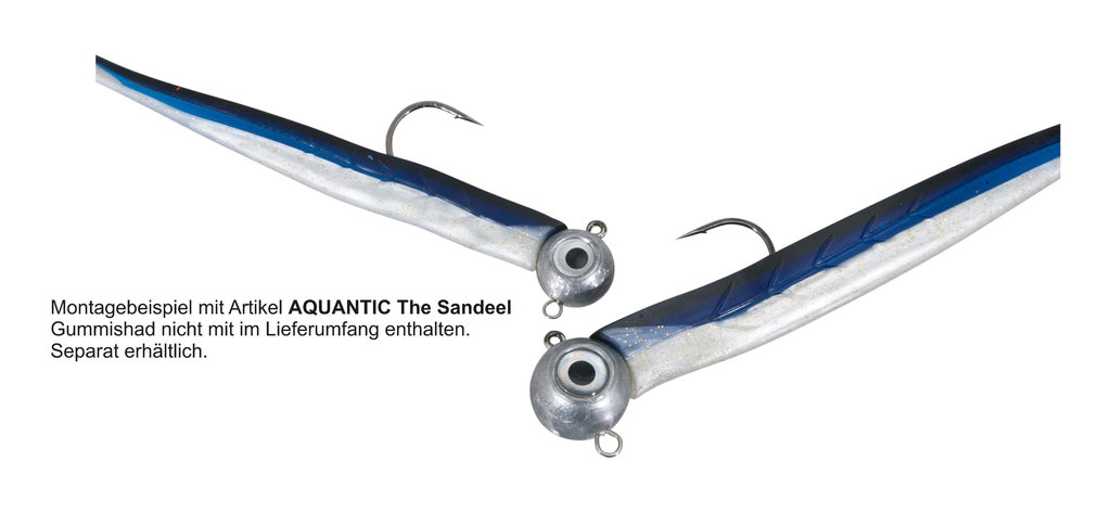 This jig head is made for sea fishing. He has a hook size 8/0, two large eyes, a baitholder and Stinger eyelet. This jig head is optimal for mounting the also available Aquantic The Sandeel softlure. Together they form an excellent and catchy bait. It can also be used with other lures. The jig head is available in 7 different weights of 50g - 180g. The weights 50g, 60g and 80g each contain 2 per pack, while the sizes 100g, 120g, 150g and 180g contain only one piece.