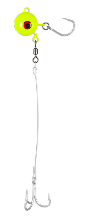 Heavyweight fireball system for saltwater fishing. The system comes with a lead head, a hook mounted with a split ring, and a size 4/0 fluorocarbon stinger with a treble hook. A special replacement hook is also included for use with soft plastic lures, for example. All hooks are coated with a rust-resistant finish. The stinger can be easily attached using the quick-change system on the lead head. The lead head is also coated with fluorescent paint. The system is available in weights from 200g to 500g.