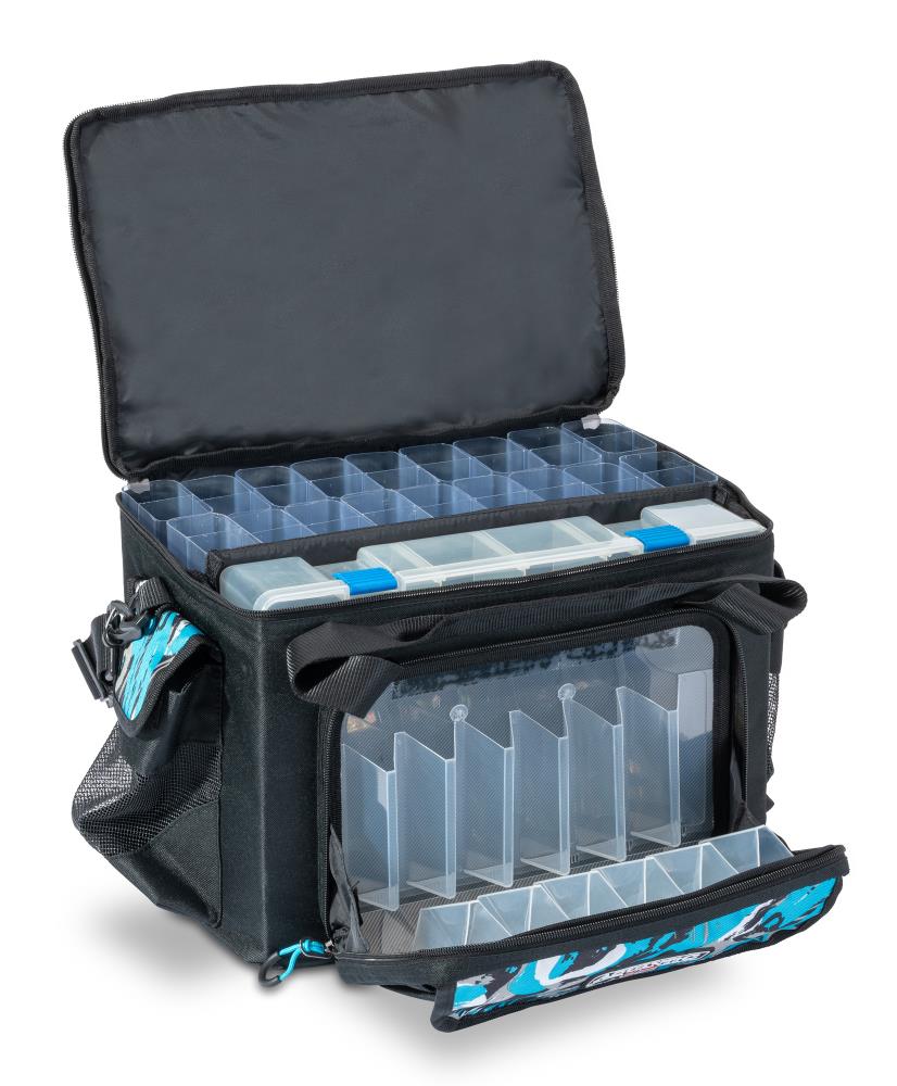 This is the ultimate bag when it comes to being flexible with your choice of bait. The main compartment contains a large bait box (36 x 23.5 x 8 cm) as well as 36 hooks for pirk etc. There is also an option to store additional small lures in the front pocket. The lid compartment contains transparent pockets for leaders, for example. Two outer pockets on the sides round off this space-saving miracle. Of course, there are also carrying handles and a shoulder strap.