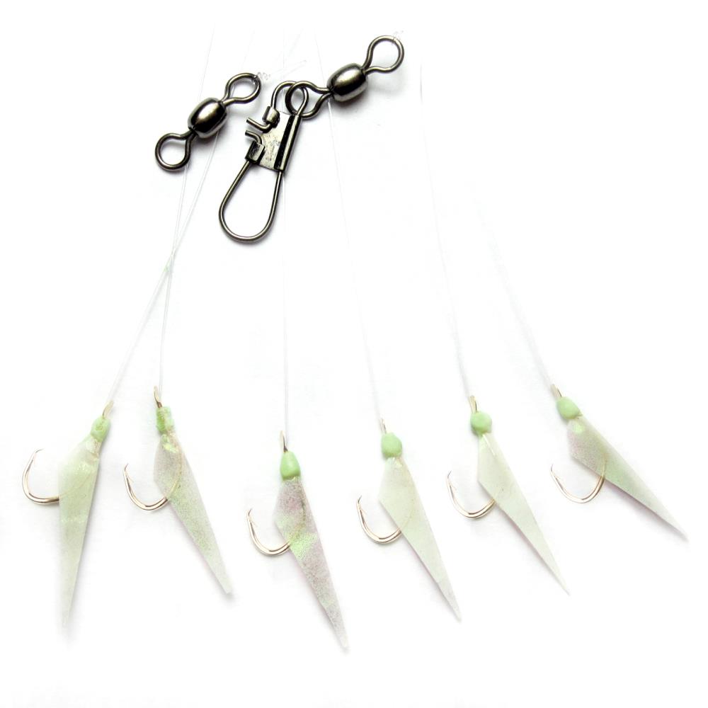 These herring leaders have Circle Hooks. The hook size is 6 and they are attached to a 6cm long mouth line with a thickness of 0.25mm. The main line with a length of 1.45m has a thickness of 0.30mm (Natural) or 0.35mm (Glow).