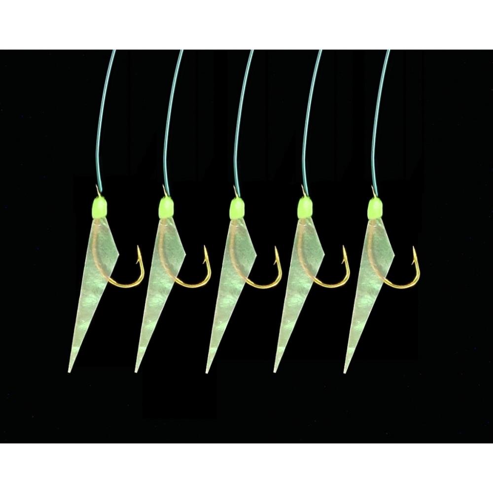 This herring rig consists of 5 side arms with hooks size 7 or 12, which are provided with real fish skin.