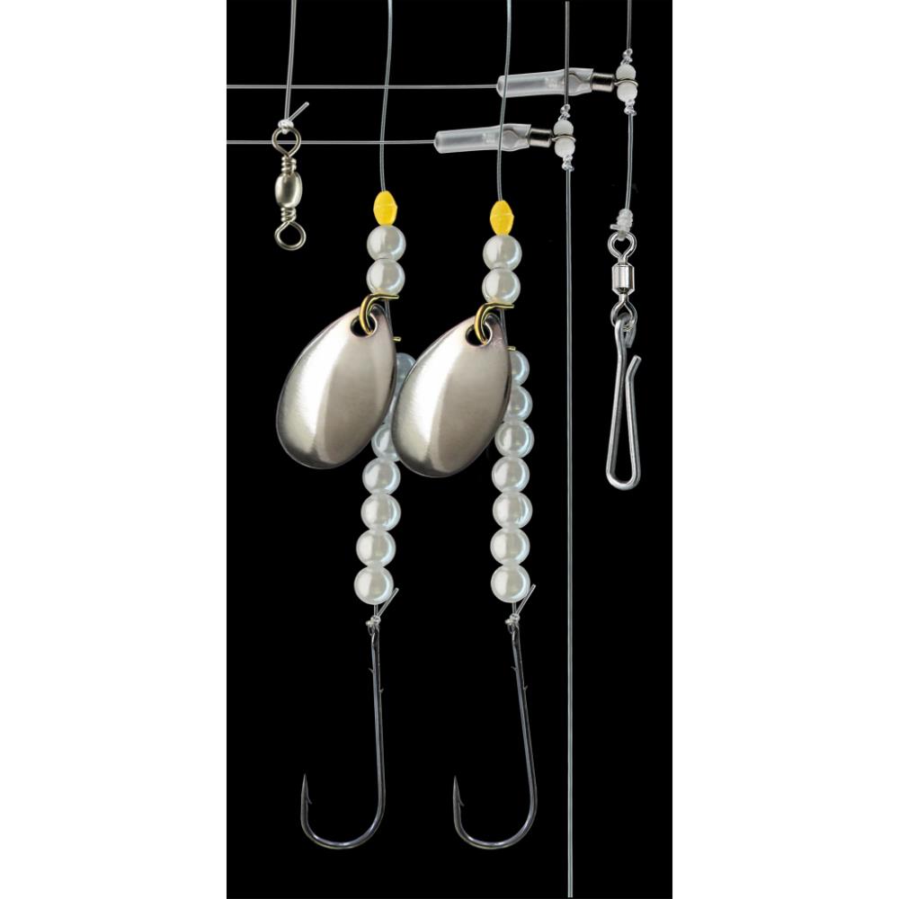 This is an attractive and very catchy natural bait leader for fishing from boats and cutters. It is equipped with luminous beads and spinner blades. The length of the 0.50 mm leader is 120 cm and it is equipped with two size 2 hooks. It is delivered on a practical EVA board. Four different versions with different beads and spinner blades are available.