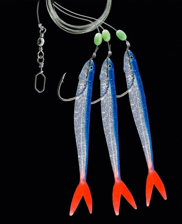 This catching paternoster is equipped with three rubber fish. It is mount on a 160cm long and 1.00mm thick main line. The side arms are attached to a 0.70mm thick monofilament line. The hooks are strong and have a size of 4/0.