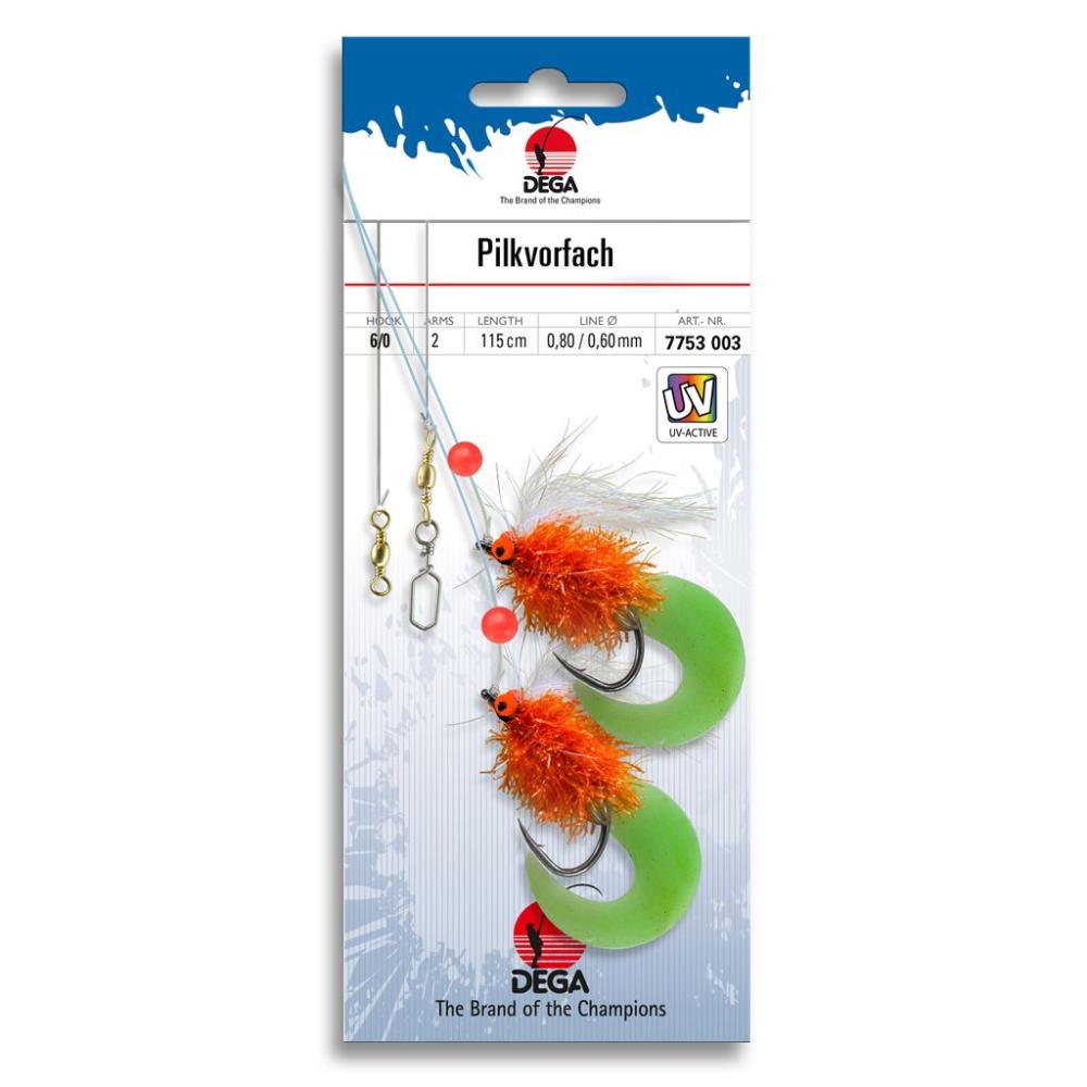 This catchy ppaternoster rig has 2 side arms. The glittering leader is equipped with UV glow beads, fringes and rubber fish. Everything is mounted with strong hooks, a sturdy swivel and high-quality leader material. This makes it ideal for fishing for cod, pollack, coalfish etc. The hook size is 6/0. The main line has a diameter of 0.80 mm and the side arms are 0.60 mm. The total length is 115cm.