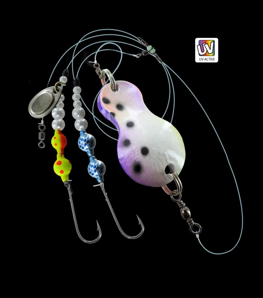 This UV-active butt spoon is mounted on an attractive leader. It is therefore a lure spoon for flatfish and sea angling. A completely finished leader with two hooks (swivel, hook, spinner blade, line and luminous beads) is already mounted on the spoon. The different colour variations and the luminous beads increase the lure's appeal to the fish.