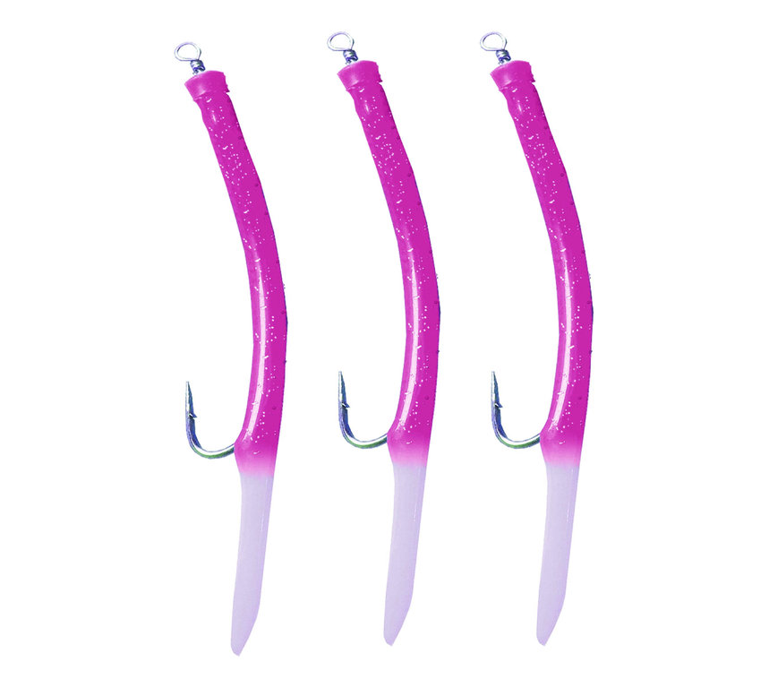 These self-luminous rubber macks have sturdy mack hooks. The light tube covers this curved hook and is equipped with a carabiner swivel. The Makk are two-coloured with glitter and a glowing end. These Makks are available in three colours and a mix. The hook sizes range from 4/0 to 12/0. Each package contains 3 Makks of the same colour (except 12/0 - 2 pieces). The mix contains one makk of each colour (except 12/0 - 1x black + 1x red).