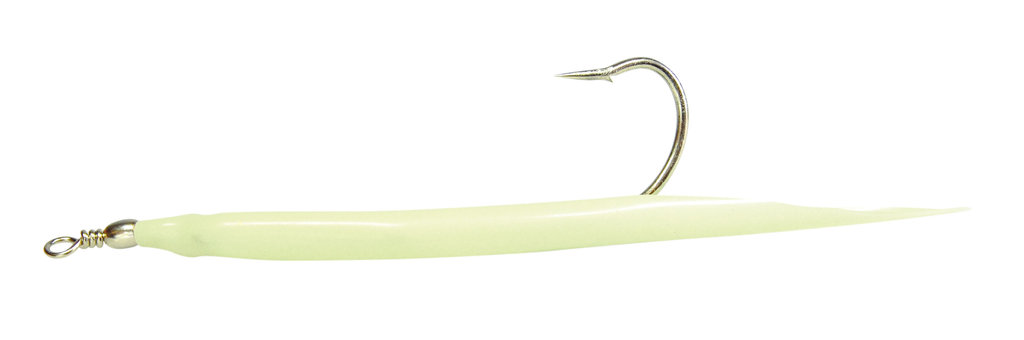 These original rubber makks are equipped with sturdy mackerel hooks. The luminous tubing covers the curved hook and is fitted with a snap swivel. This lure is a perfect imitation of a sand eel. It is available in six different, effective colors and in sizes 6/0, 8/0, and 12/0. Each pack contains three lures.