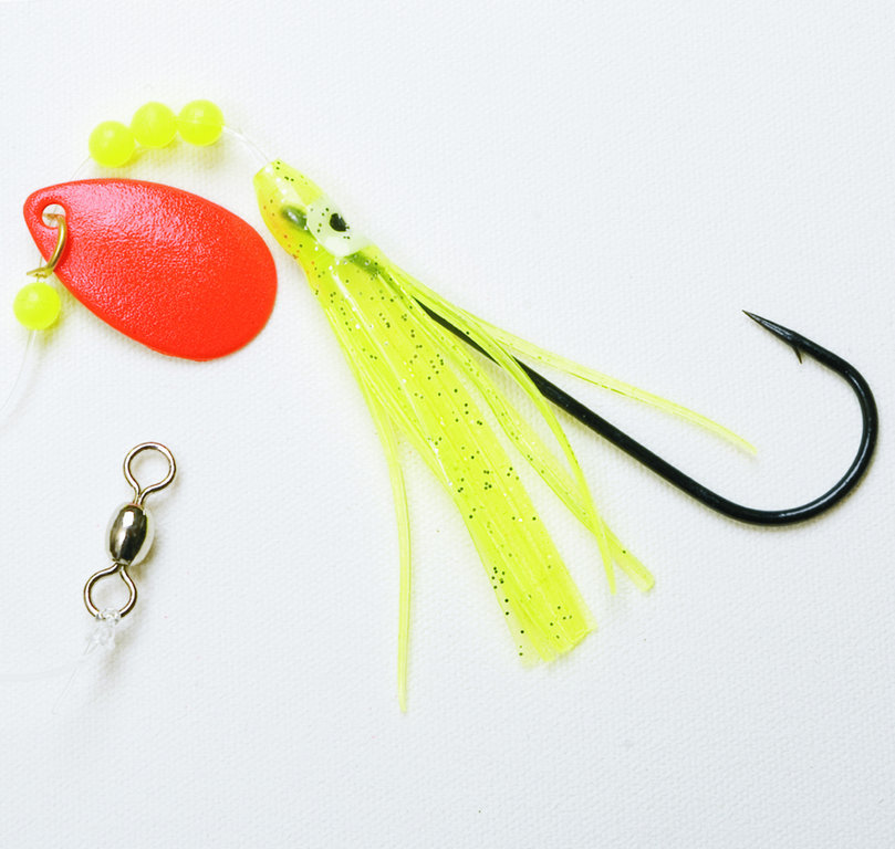 This rig has a single hook in size 4/0 or 6/0. Before hook a coloured Mini Octopus, a spinner blade and 4 fluorescent beads upstream. Available is this rig in three colours. With the strong 60lbs line of this rig is it suitable for catching cod, ling, small conger, dogfish and other predators.