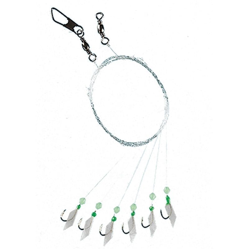 This herring rig consists of a 0,25mm thick main line with six side arms and one hook each. The golden hooks are provided with fish skin and at the end there is a fluo bead. The leader is available in hook sizes 16, 14 and 12.