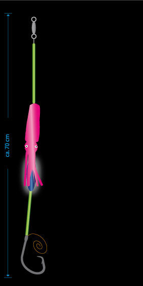 This is an octopus system with an integrated flashlight, fluorescent tube, and propeller for additional stimulation. It is 1.20m long and has a line diameter of 0.70mm.