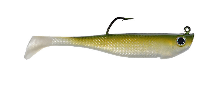 This rubber fish has an integrated lead body. It has a paddle tail that provides plenty of pressure. The jig is available in the colors olive-pearl and blue black. With a size of 15cm (6.5 inch), it is available in 115g, 140g and 170g.