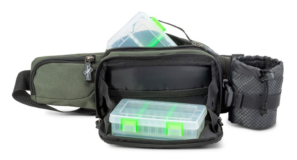 This system has six pockets including a drink holder. It is all attached to an extremely well-padded and very wide belt. Perfectly suited for light spinning luggage or for the fly fisherman, who has everything he needs at hand with this bag.