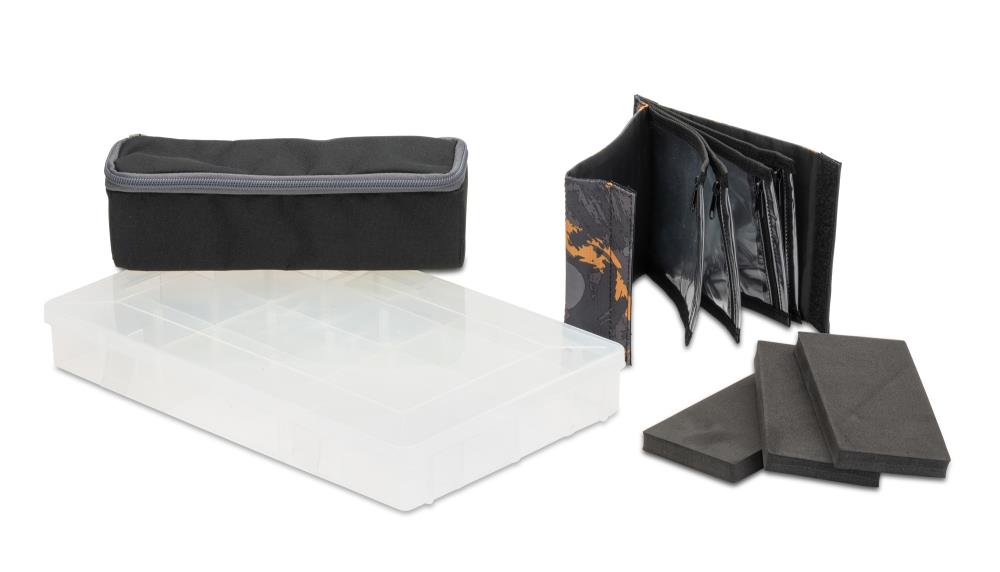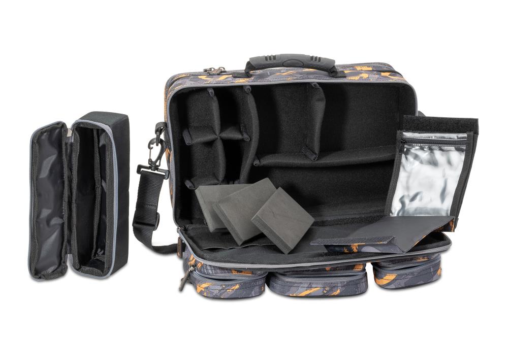 A bag not only for die-hard trout anglers, because all padded compartments offer enough space for all predatory fish accessories. Inside the bag there is a compartment divided into 6 compartments (divider removable) for safe transport of Trout Bait, 3 hard foam panels, a smaller pocket for storing poses or sbirolinos. A removable Rig Wallet with 4 zipped pockets, 3 elastic rubber bands for inserting sbirolinos or other accessories. In the back area there is a Variobox measuring approx. 35 x 22 x 5 cm for storing accessories. In the front section, 3 further patch pockets provide additional storage space. The ergonomically shaped handle and the padded shoulder strap guarantee comfortable transport.