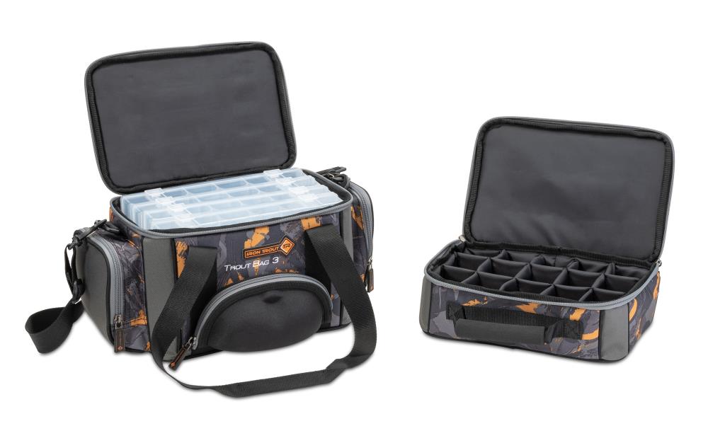 A useful addition to the well-known and popular Trout Bags. The upper part of the bag has space for 24 glasses, e.g. from the T-Bait series. The upper part can also be removed with Velcro. In the lower main part of the Trout Bag there are four boxes. In addition, there are three outside pockets on this part, one of which is specially designed for storing the pole glasses.
