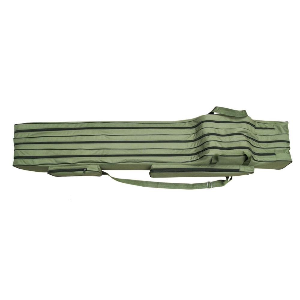 This rod case is ideal for transporting fishing rods. Thanks to the 3 separate compartments with zip and reel recess, 3 to 5 mounted rods with reels can be easily transported. In addition, the rod bag has 2 spacious outer pockets for accessories such as rod holders as well as two shoulder straps (carrying function as a backpack) and additional carrying handles. Available in two different lengths.