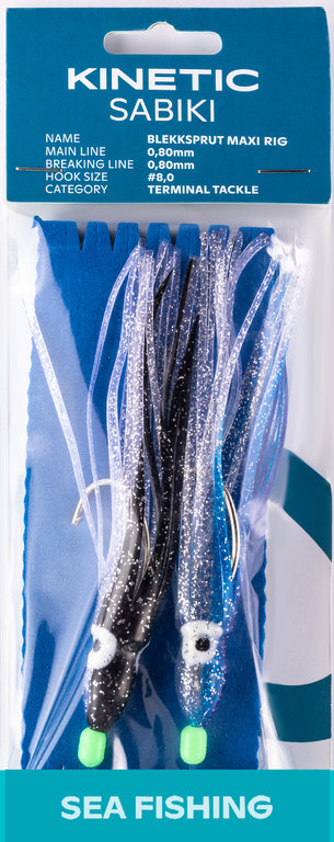 If the bait you are after likes to dine on squid, then this is an effective way to capitalize. Ther Sabiki Blekksprut Maxi Rig is designed to quickly attract cod, pollack, coalfish and any other large prey fish that will slurp a squid.
