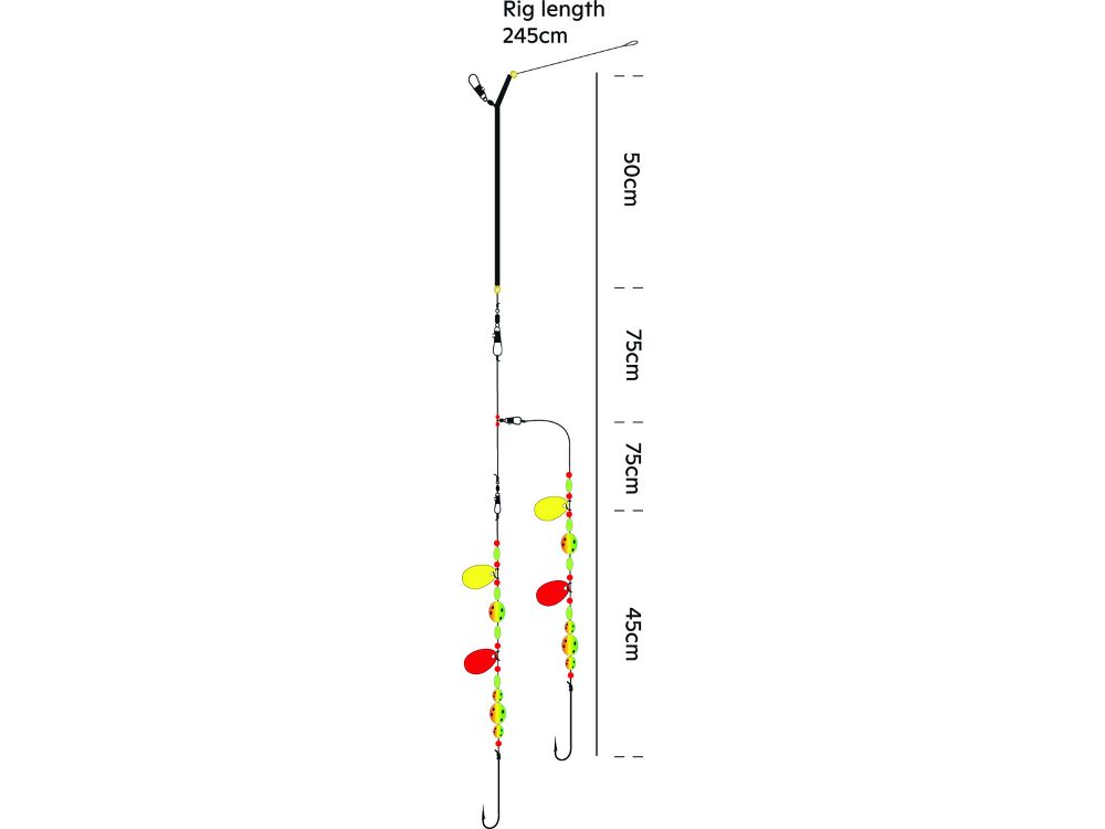 This colourful rig, with spinner blades is extremely popular, especially on clean bottom. The sliding boom gives direct contact, even with heavier sinkers.